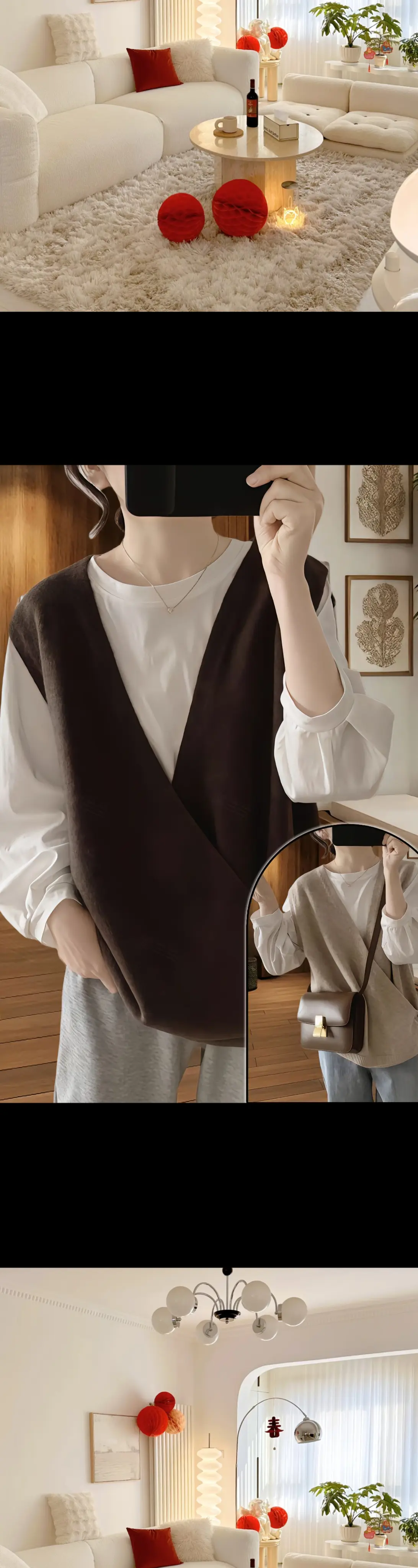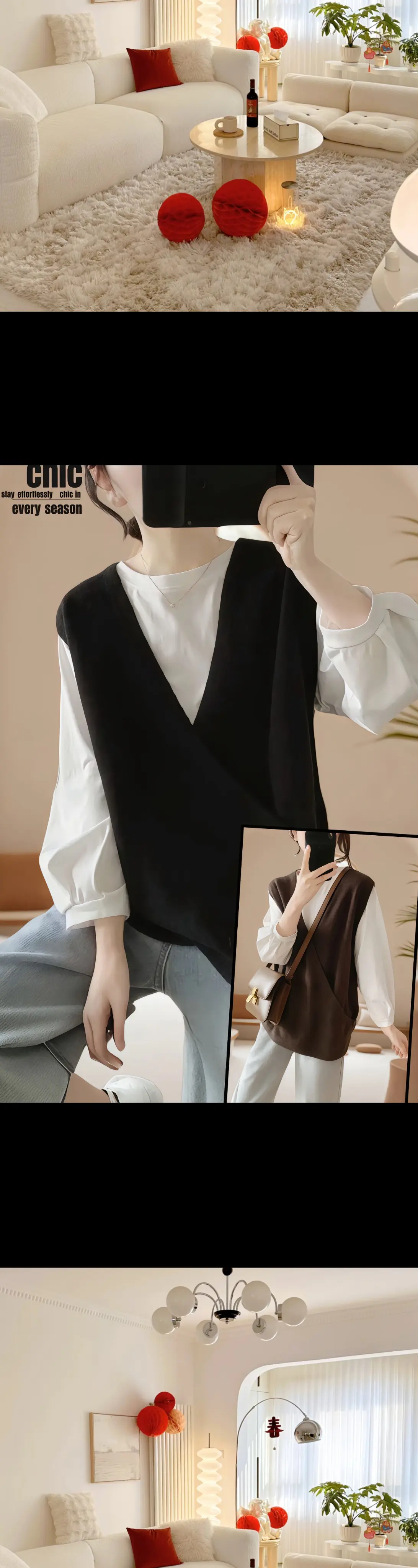 不规则设计的针织背心,摆脱常规,穿上身立刻告别沉闷与单调,层次感拉满。内搭的灯笼袖T恤,袖口微微蓬起,像个复古小泡泡,精致又可爱。 宽松版型对各种身材都超友好,肉肉都被巧妙藏起来,显瘦效果一流,穿上它秒变纸片人。面料软软糯糯,贴身穿舒服到不想脱,好像被云朵轻轻包裹。而且这种简约风真的很减龄,穿上秒回18岁,日常出街、通勤、约会都能轻松驾驭。