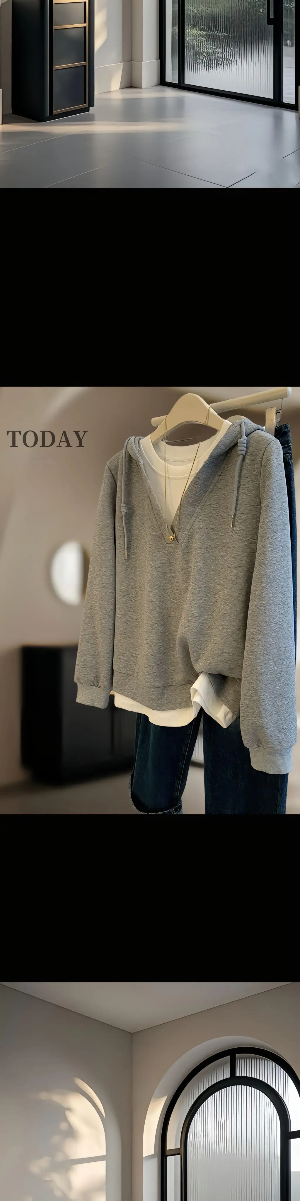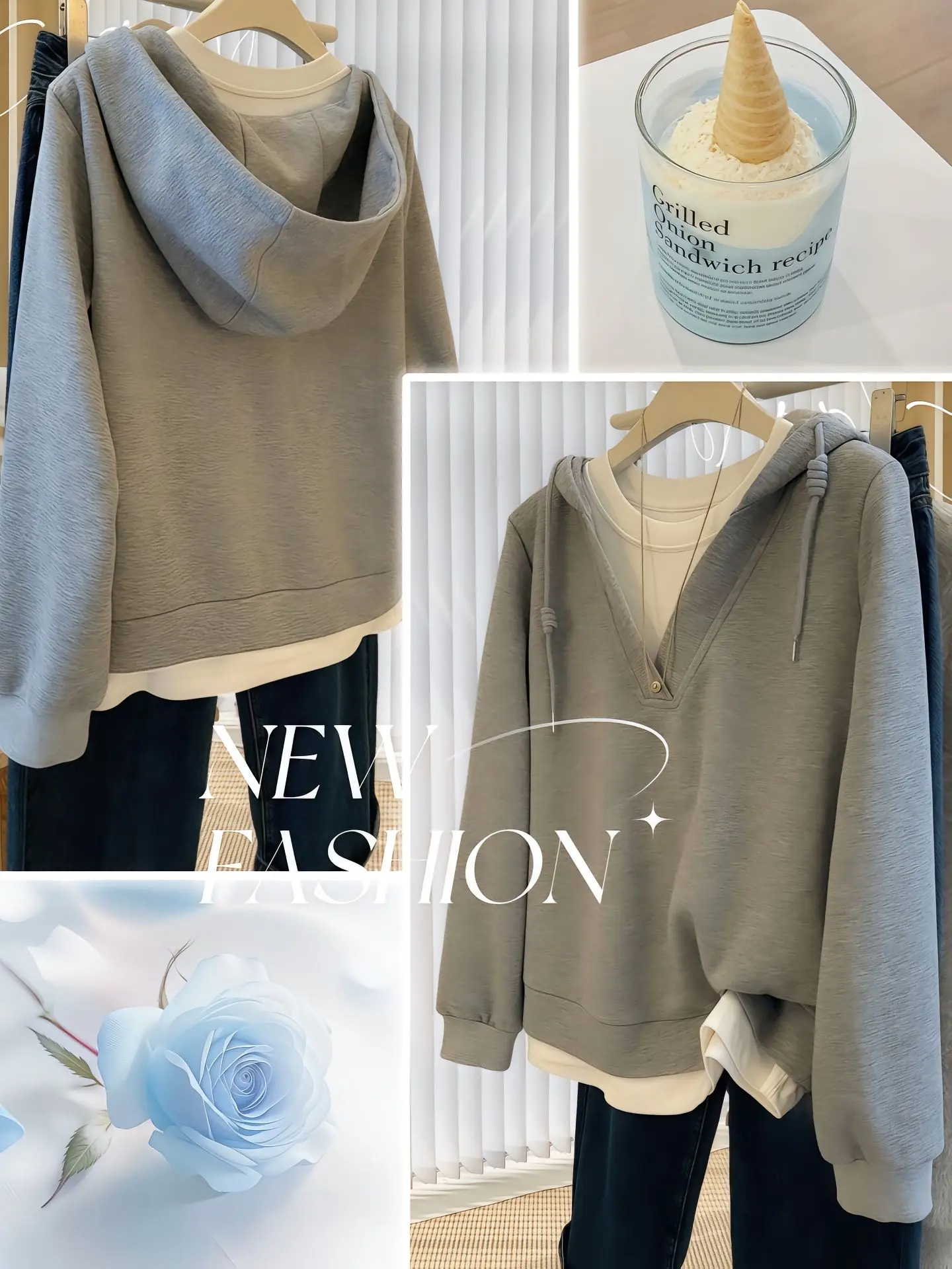 微胖女孩的春日穿搭难题,高级感十足的灰色调,低调又百搭,轻松适配各种风格。 大码专属版型,对微胖身材友好,不勒不紧,包容每一处肉肉,让你行动自如。假两件的设计堪称点睛之笔,V领修饰颈部线条,连帽增添俏皮感,层次丰富,时尚度飙升,随便搭配一条阔腿牛仔裤,轻松变身街头潮人。 面料软糯,贴身穿仿佛被春日暖阳轻抚,温暖又舒适,宅家穿、出街穿,都自在随性。宽松的版型更是慵懒感满满,毫无束缚感,一举一动都尽显洒脱。