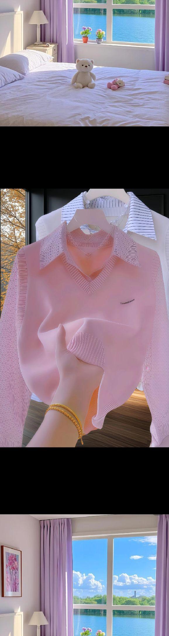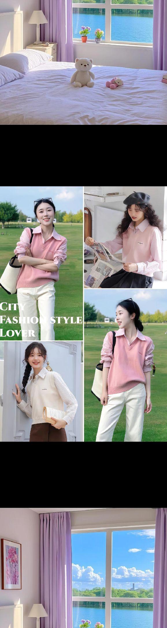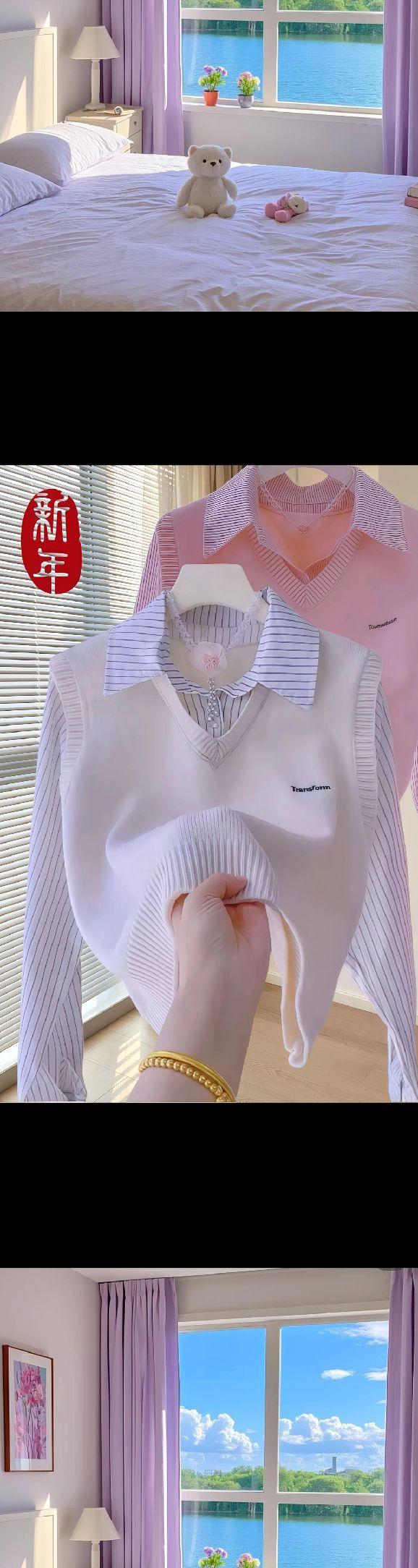 姐妹们,春日叠穿美学的典范,衬衫马甲针织假两件来了!它巧妙融合了衬衫的...