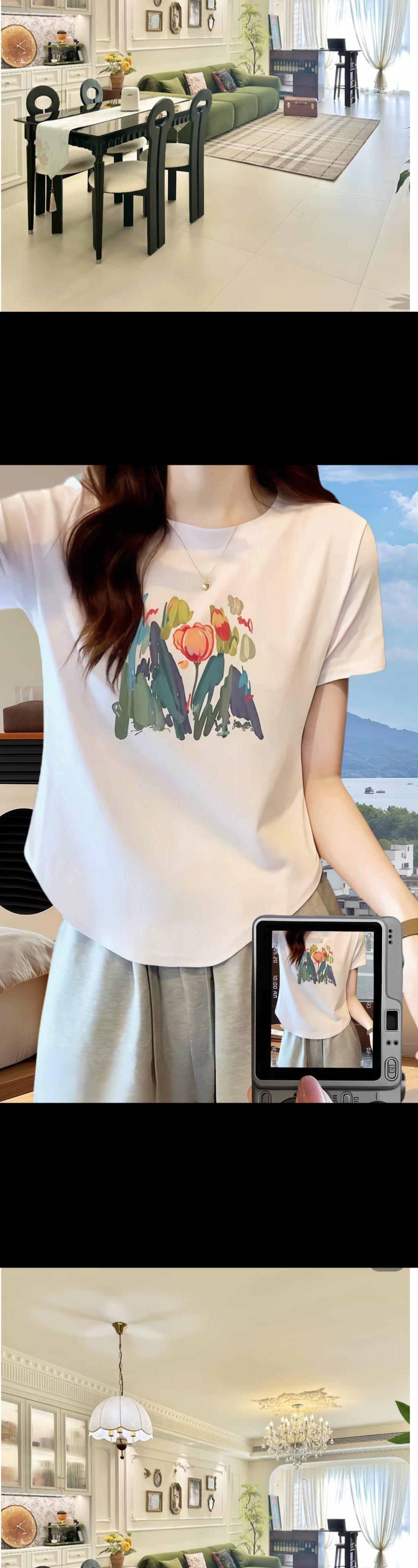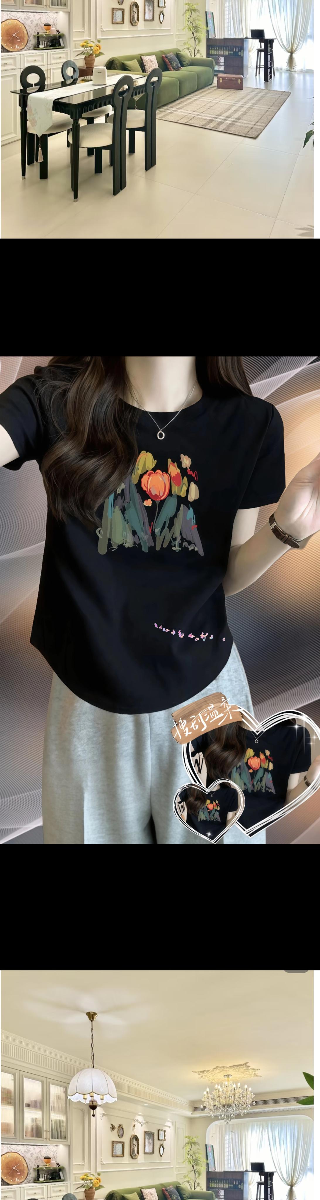 这件大码修身版型短袖,遮肉显瘦的同时,还能穿出优雅气质!弧形下摆设计,巧妙修饰腰腹线条,贴合身材曲线,展现优雅身姿!白黑杏三色可选,经典简约,轻松搭配各种下装,穿出不同风格!70-200斤都能穿,真正的大码友好,让你穿得自信又美丽!舒适圆领设计,精致印花点缀, 简约而不简单,为整体造型增添一抹亮眼细节!
