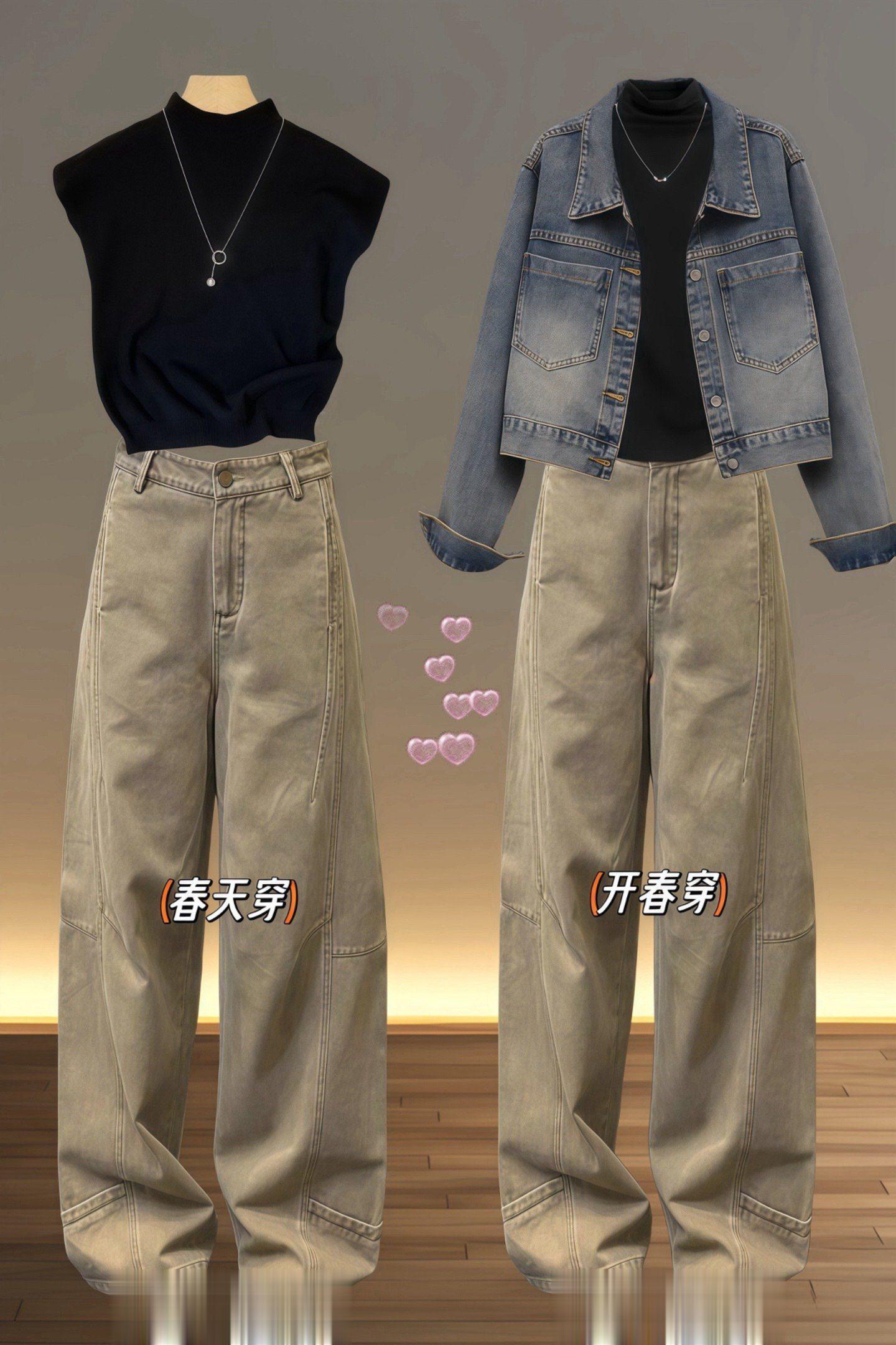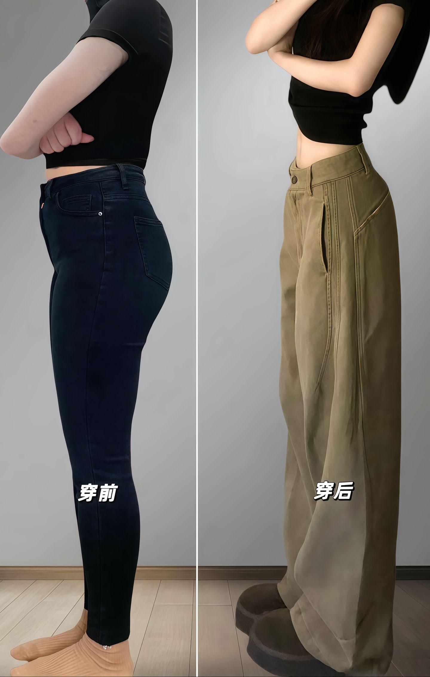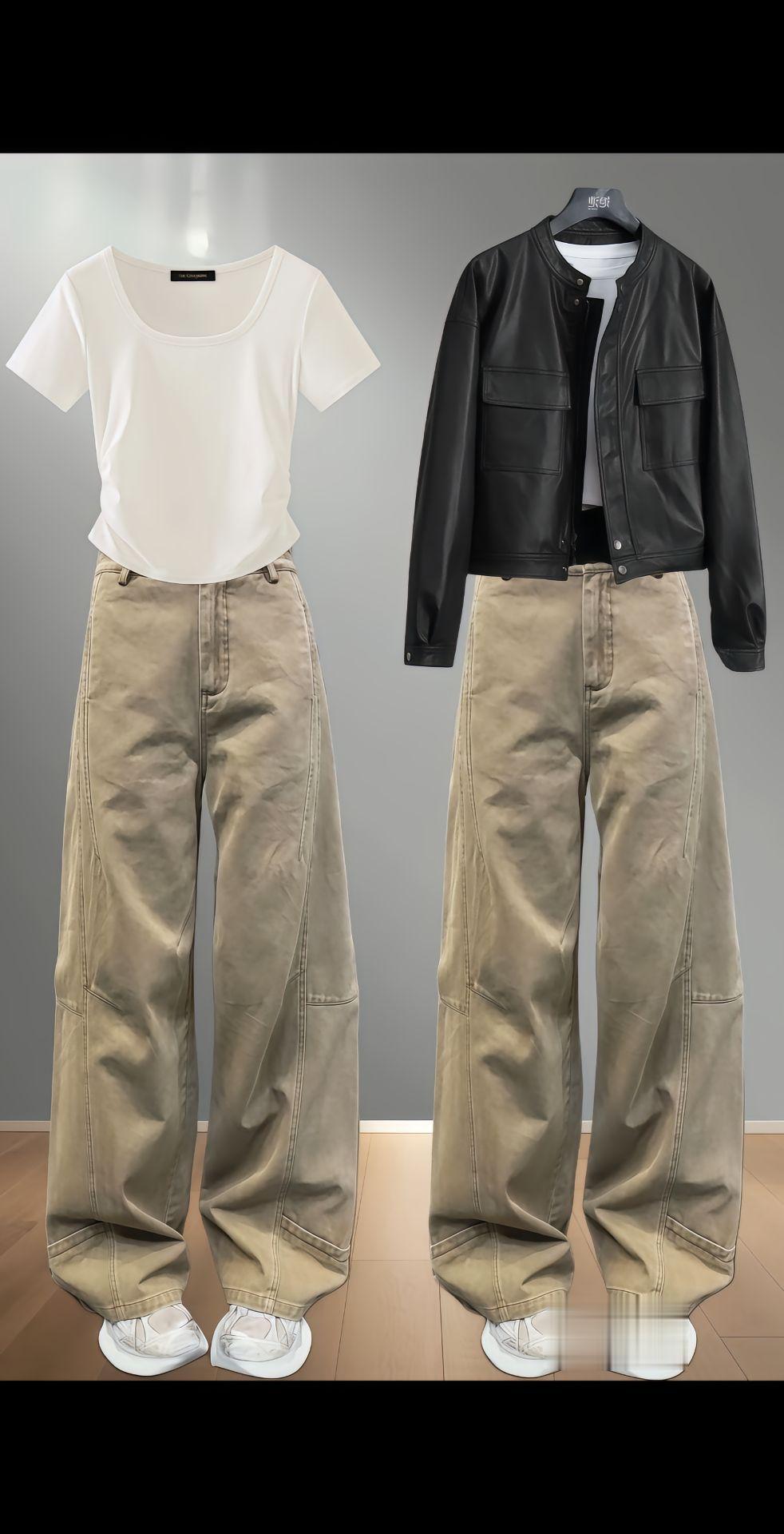 高腰设计感卡其色阔腿牛仔裤~时髦洋气,百搭显瘦,遮胯遮肉,修饰腿型~