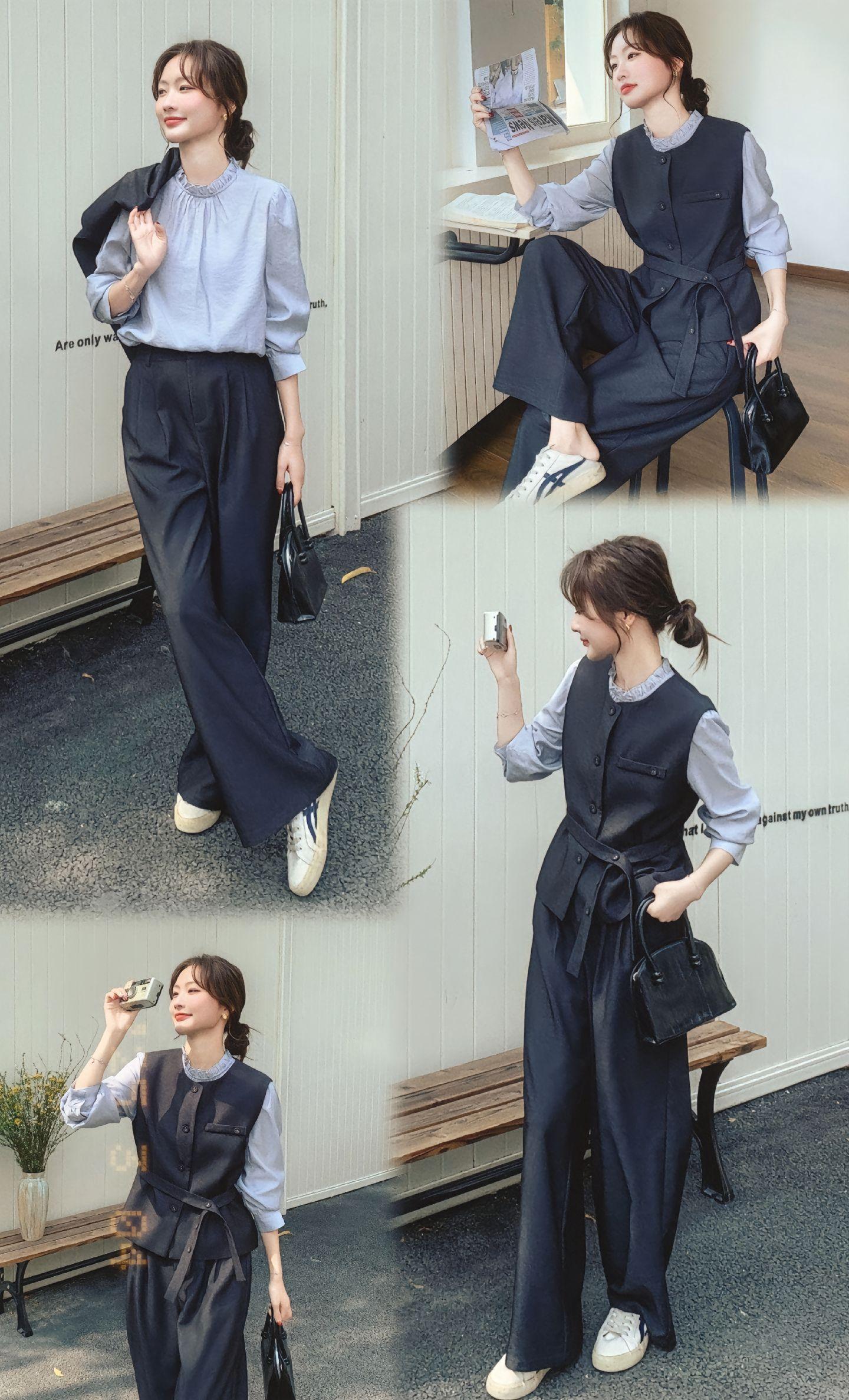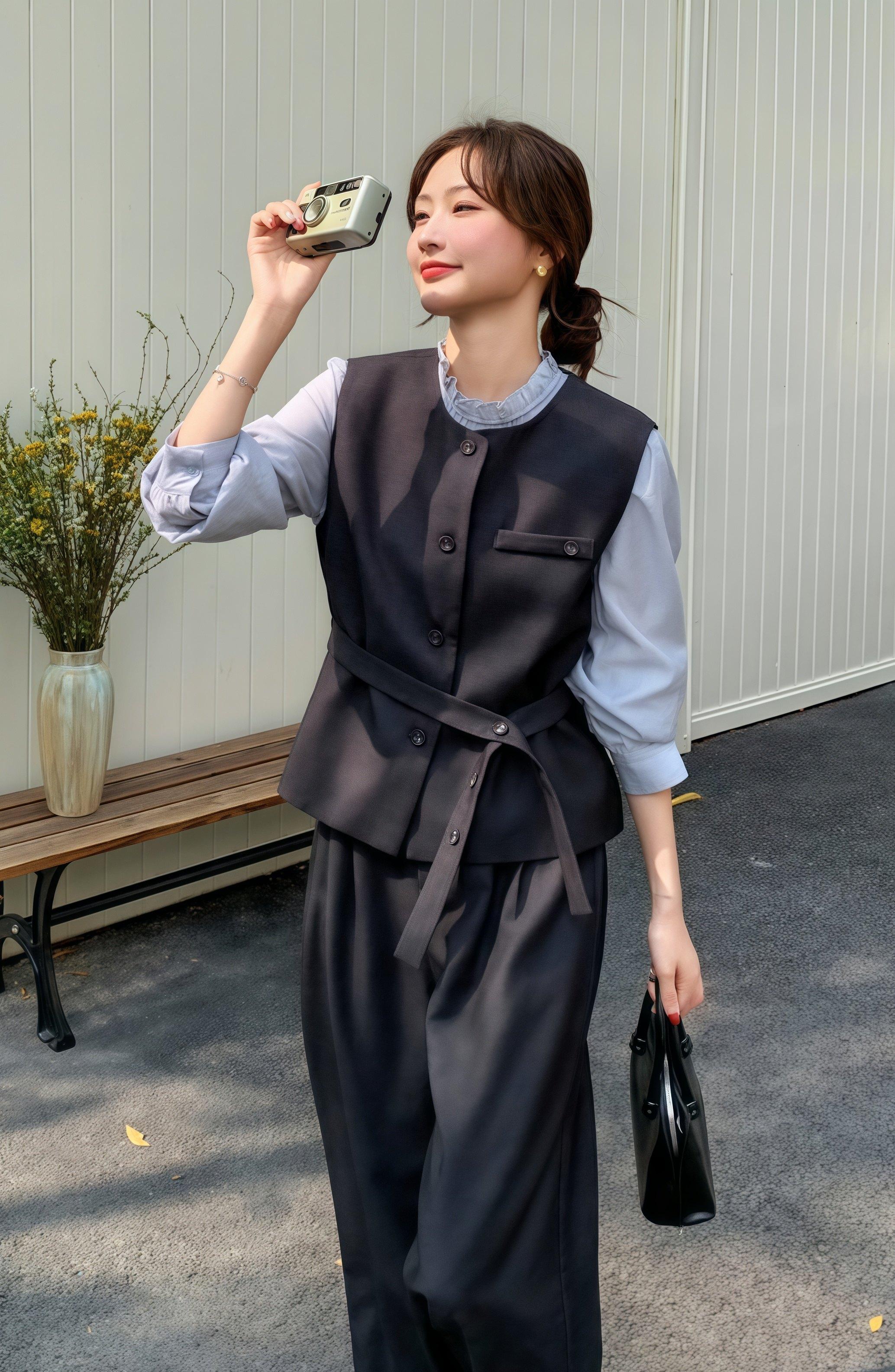 一份来自春日的OOTD|韩系慵懒风的快乐。好像懂韩女的氛围了。马甲+衬衫+同色系阔腿裤,韩里韩气的,吼吼看!一套上身遮肉显瘦,气质减龄,高级感满满!版型包容各种身材