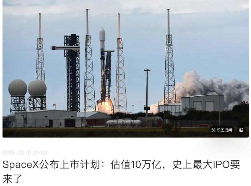 12月10日,马斯克在社交媒体上确定,SpaceX将于2026年上市,这家公司全球资本都盯着,估值是很确定的,1.5万亿美元。