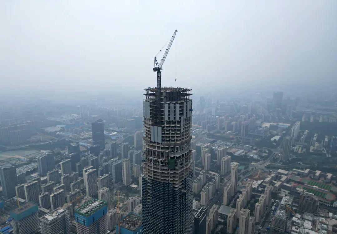 济南平安金融中心,地上63层,总高度360米,在五座标志性超高层建筑“山、泉、湖、河、城”之中代表“河”,也是其中第二高楼,同时也是济南第二高楼。目前已经基本完成塔冠的玻璃幕墙安装,正在对原施工电梯所在的“拉链”位置进行外立面施工,即将封口。