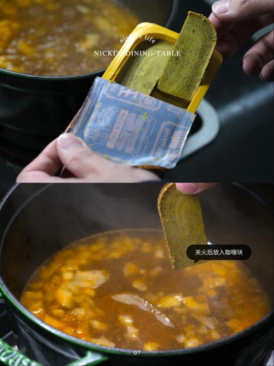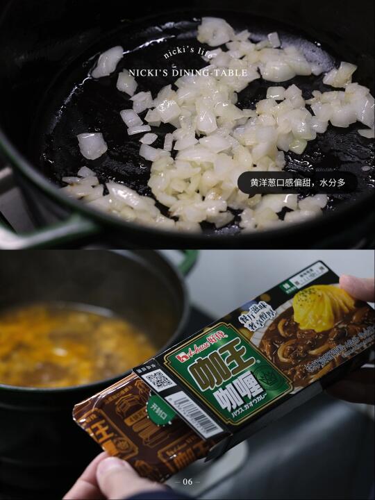 ❗️汤咖喱需要选择口感浓郁醇厚的咖喱块,浓郁的咖喱块,食材才更容易裹上味。喜欢吃辣的话,可以选择自带辣味的,我用的这款是好侍咖王5号辣,能吃辣的小伙伴也可以试试7号激辣,咖喱块用对了,在家可以轻松还原出餐厅的日式咖喱料理。