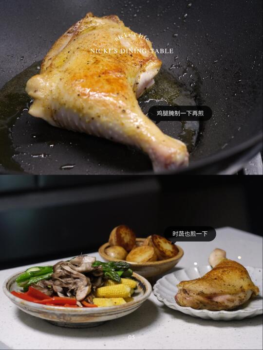 · 鸡腿用剪刀剪开一面(更容易入味),用胡椒盐、咖喱粉腌制15分钟,平底锅中倒油,鸡皮朝下放入,煎至表面金黄取出。
