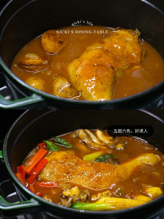 ·煮开后关火放入好侍伽王咖喱(掰开后放入,方便溶化)、溶化后开小火,先放入较难入味的鸡腿和土豆煮10分钟,再放入其他食材炖煮5分钟左右。