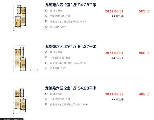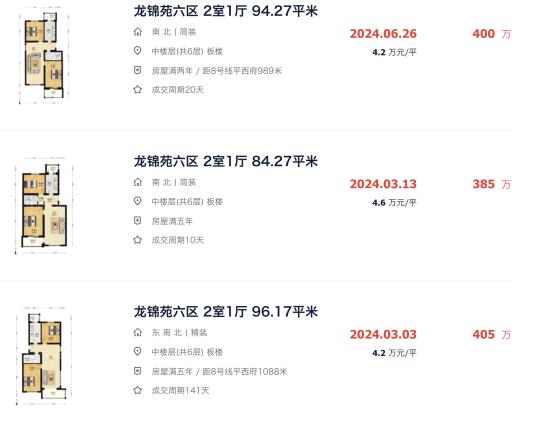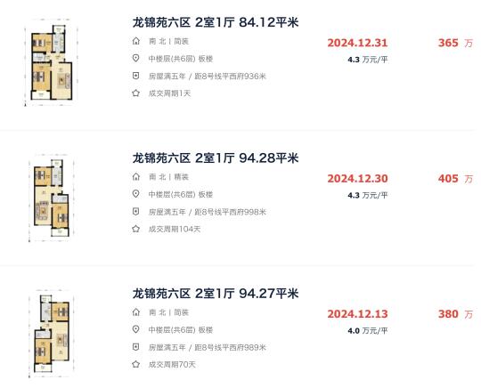 龙锦苑六区94平两居室最近一套的成交时间是2024年12月,成交总价是405万,同楼层同户型的最高点成交时间是在2022.8月,成交价是505万。 两年4个月的时间,房价跌了100万! 下跌20%,这个幅度从北京整体来看其实不算什么,但是100万对于很多普通家庭甚至是5到10年的一个积蓄,时代的尘埃落在普通人身上确实是一座大山。 龙锦苑六区,在江河日下的房价下跌潮中能相对较稳,可能有几个相对优势有一定关联: 楼龄:和回龙观片区的云趣园、龙华园、华龙苑南里等众多1998年左右的小区相比;龙锦苑2004年左右的房子算是多了几年的喘息空间。 教育:龙锦苑六区对口小学为昌平育新小学,这个小学在昌平区绝对算能打的。 交通:13号线拆分线利好,可以说未来的【文华路】站就在龙锦苑六区的门口,步行五分钟可达。 其他配套:对面的回龙观文化公园和附近的文华市场可以说都是这个小区的加分项。 不过,无论怎样,历史的车轮还是滚滚向前,房价涨跌反应的就是市场规律。