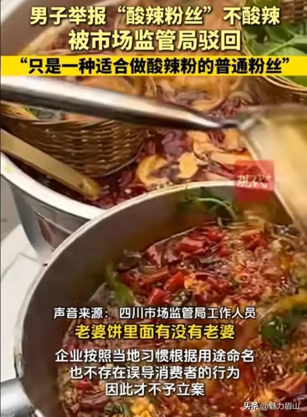 【四川一男子举报酸辣粉不酸辣被驳回,当地市场监管局:老婆饼里没老婆,牛轧糖里没有牛】近日,有网友在社交平台发帖称,他举报四川一家企业生产的酸辣粉丝没有酸辣味,结果被当地市场监管局驳回。 3月13日,四川天府新区眉山管委会市场监管局相关人员回应,当事人举报的酸辣粉丝只是一种适合做酸辣粉的普通粉丝,没有酸辣味是正常的,不存在误导消费者的行为,因此才不予立案。 据了解,当事人举报的是一款由四川仁寿光明食品有限公司生产的酸辣粉丝。他认为产品的包装上写有“酸辣粉丝”字样,强调的是粉丝的口味,但实际上这款粉丝却并不酸辣,他认为这一情况涉嫌误导消费者,随后向四川天府新区眉山管委会市场监管局投诉举报了这家公司。没想到,市场监管局最终给出的回复是,酸辣粉丝不酸辣不存在误导消费者情形,并以投诉举报人提出的事实不存在为由,不予立案。 上述内容在网上发布后,引发广泛关注。 “我们接到举报的时候也很重视,专门做了调查,也做了探讨。”天府新区眉山管委会市场监管局一位工作人员告诉记者,去年9月12日,在接到投诉举报信后,他们做过仔细的调查,还到企业去走访过,最后才给出的不予立案的结果。 该工作人员称,被举报的产品并不是和方便面一样的那种速食酸辣粉,只是一种适合制作酸辣粉的普通粉丝。 包装上的“酸辣粉丝”只是产品名称,是根据产品的用途来命名的,这种情况在川渝地区比较常见,一些散装的粉丝也常会被称为酸辣粉丝,但这并不是对粉丝味道的描述。 另外,产品包装上也写得很清楚,需要后期添加佐料后才能烹饪出美味的小吃酸辣粉。因此,被举报的酸辣粉丝没有酸辣味是正常的,“就像老婆饼里没老婆,牛轧糖里没有牛一样。 实际上,举报酸辣粉丝不酸辣并非首次发生。公开信息显示,早在2023年12月份,也有人在重庆举报这一问题,当地市场监管局同样给出了不予立案的处理结果。 江苏柏金律师事务所刘国庆律师认为,商家遵循地方习惯为产品命名,并非故意违法,市场监管部门根据事实情况不予立案也无不妥。他建议,类似产品外包装上最好做一个解释,避免外地消费者误解。(来源:现代快报)