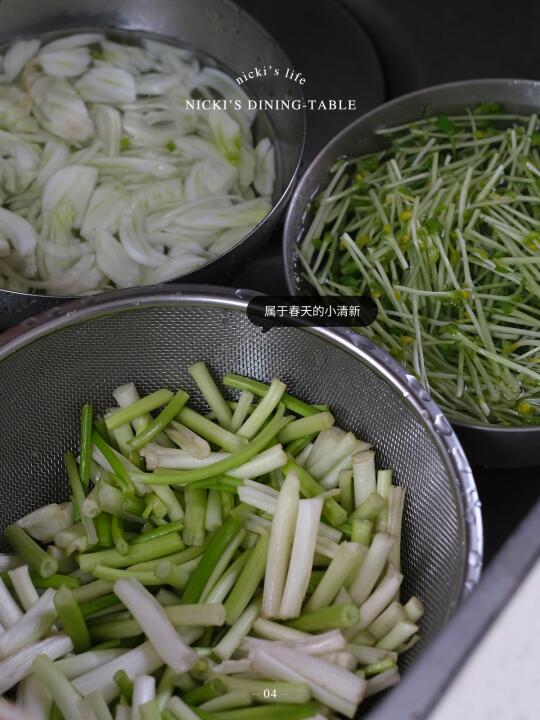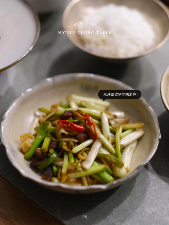 春天的野菜苦味其实相比苦瓜来说,还是比较温和的,和肉类或是其他食材一块炒制,苦味也会被中和掉一些。 - 🔅今天c位菜谱:水芹菜软哨炒糯米笋🔅 ·水芹菜洗净切段,糯米笋洗净备用。 ·热锅冷油,倒入蒜片、小米椒、软哨,翻炒出香味后,放入水芹菜,糯米笋,快速翻炒后放盐炒匀即可 🥗 菜单: -水芹菜软哨糯米笋 -糖醋小排 -茴香头牛肉 -豆苗蛋花汤