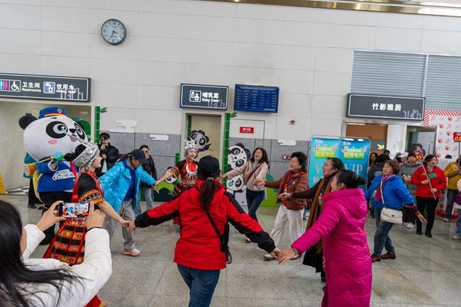 此趟“熊猫专列·安逸号”旅游列车将停靠大英东、重庆西、贵阳、安顺等车站,旅程中游客不仅可以品尝到苗家特色酸汤鱼火锅、布依族特色“簸箕宴”等特色美食和小吃,品味舌尖上的美食,旅行团还精心安排了篝火晚会、布依族盛大迎宾、苗家敬酒仪式、观赏布依歌舞表演等沉浸式感受民族风情。