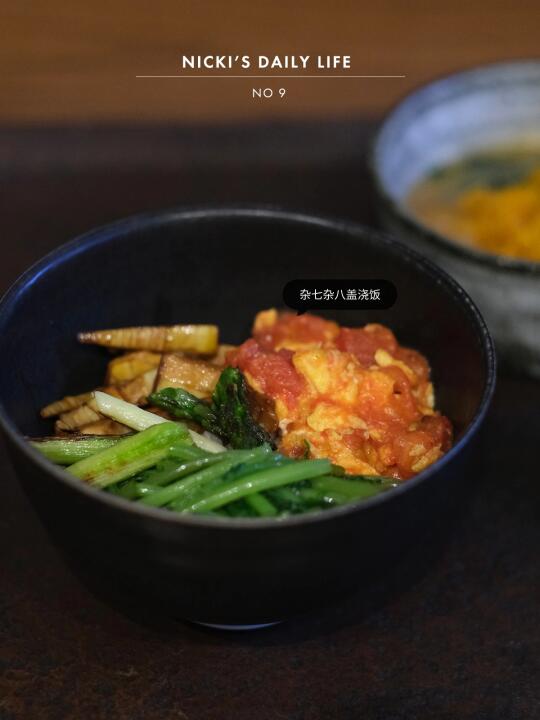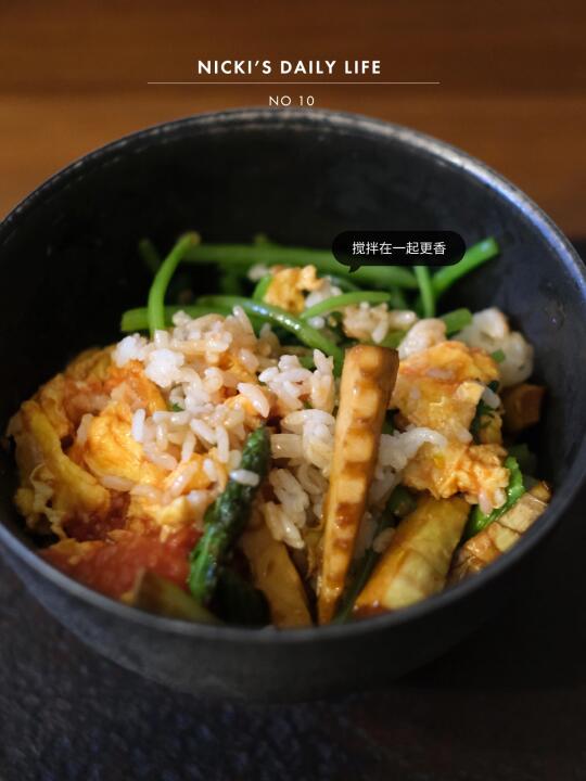 冰箱里剩下的菜量不多,但品种不少,简单炒制一下做成盖浇饭,吃的时候把所有食材全拌匀,也许有人觉得窜了味,但我喜欢这样!