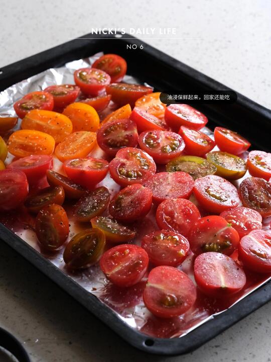 冰箱里的小番茄一顿吃不完,分装了一些给妈妈,剩下的油浸起来,中午做一份油浸番茄意面…
