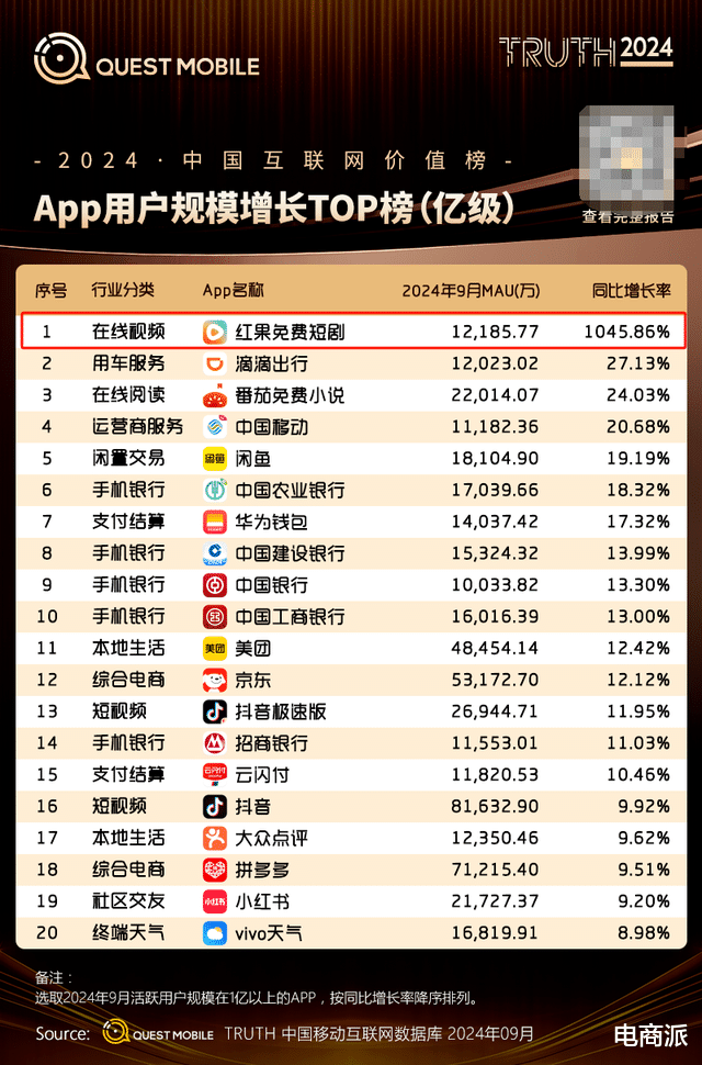 同年9月,红果短剧月活跃用户已突破1.2亿,同比增长高达1045.9%,成为增速最快的应用之一。