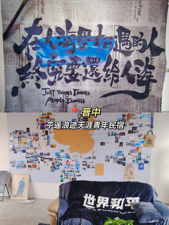 离平遥古城非常近,只需要步行500米。24年新开业的青旅, 房间设施非常新,有床帘和储物柜。装修风格也很独特温馨,老板是一个年轻大哥,青旅的客厅有一面地图墙,上面都是他在全国各地的旅游照片。对面还有一个留言墙,很多住客都在上面写下了他们的故事,充满着青春自由的气息,温暖而感动。