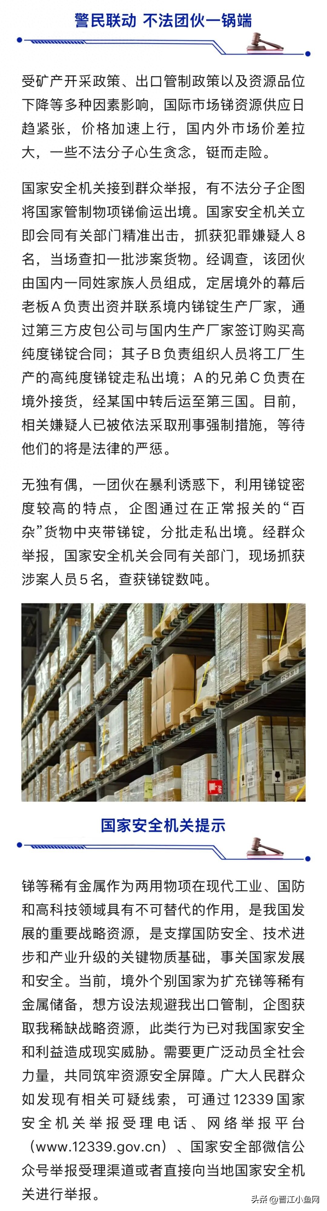 近期,国家安全机关会同有关部门破获多起为牟暴利,内外勾结企图将锑资源偷运出境的案件,有力维护了国家资源安全。