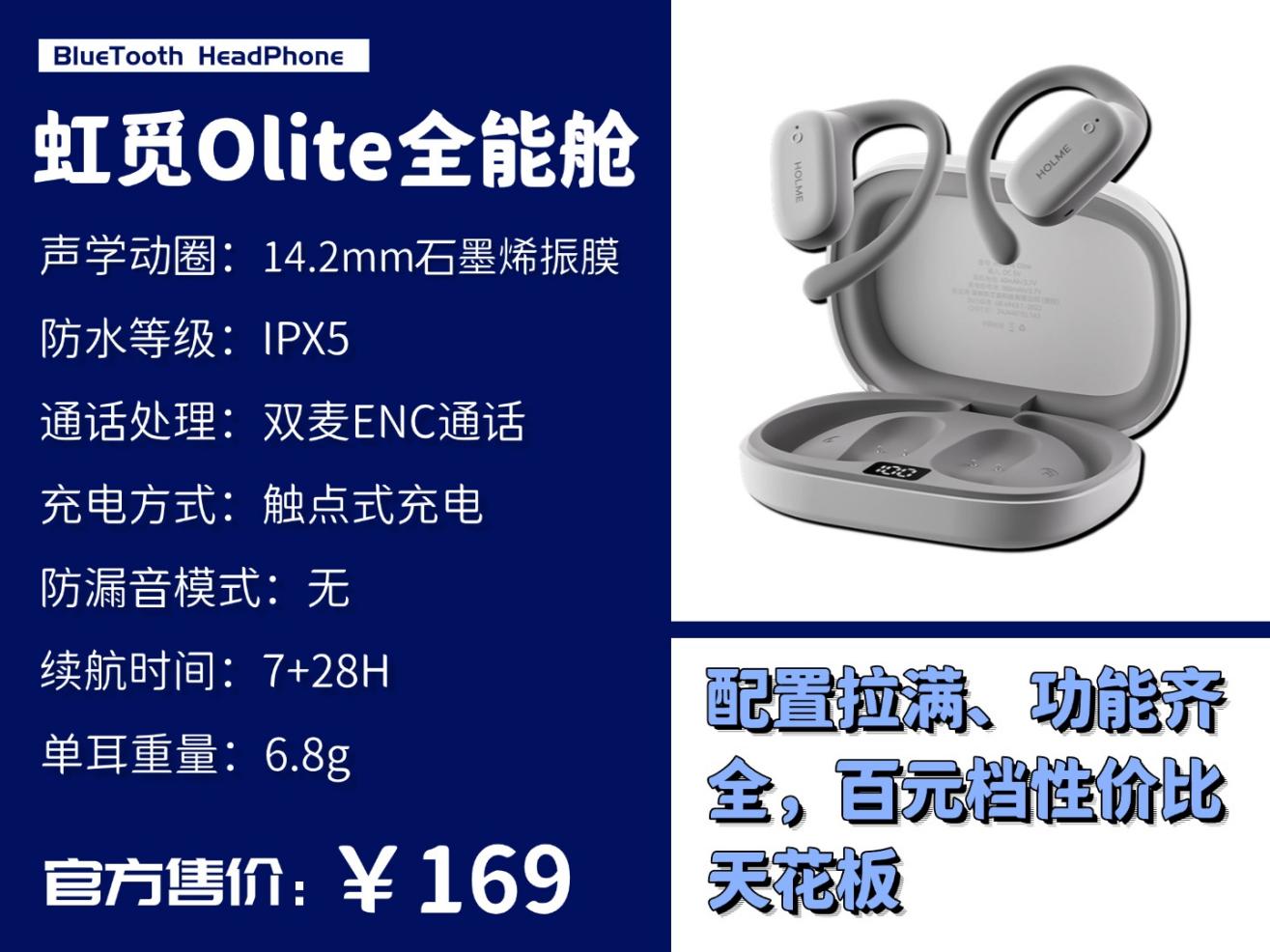 在百元开放式耳机里,虹觅 Olite 全能舱的表现称得上是同价位最高,169 元的价格能给到这样的配置和体验,完全超出预期。单耳 6.8g的重量做到了完全轻量化,26° 工学弧面耳挂的贴合度做得特别好,贴合耳廓却不压耳,日常佩戴几乎没什么存在感,稳固性也在线,日常走动、通勤都不会轻易晃动脱落。