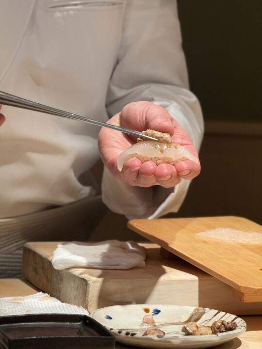 除了店员おすすめ的酒不太好喝和前菜的mochi我不喜欢之外没有缺点[萌萌哒R] 鳗鱼和uni格外好吃[喝奶茶R] 大将展示菜品的时候会很耐心等拍照,btw完全没想到mochi和甜点ホワイトチョコレート