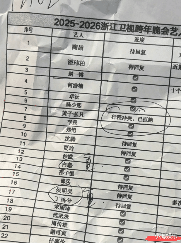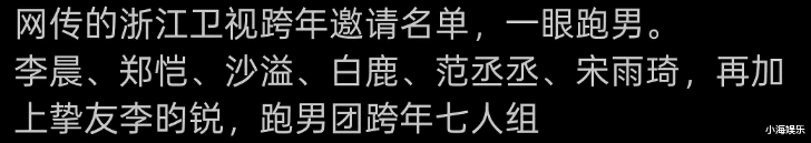 另外,网友曝光了浙江台跨年晚会的拟邀请名单,以及已经确定参加演出的部分明星阵容。除了以上猜到的明星,还有增曾舜晞,魏大勋,刘宇,张碧晨,袁娅维,范程程,苗苗、金莎,徐艺洋等。
