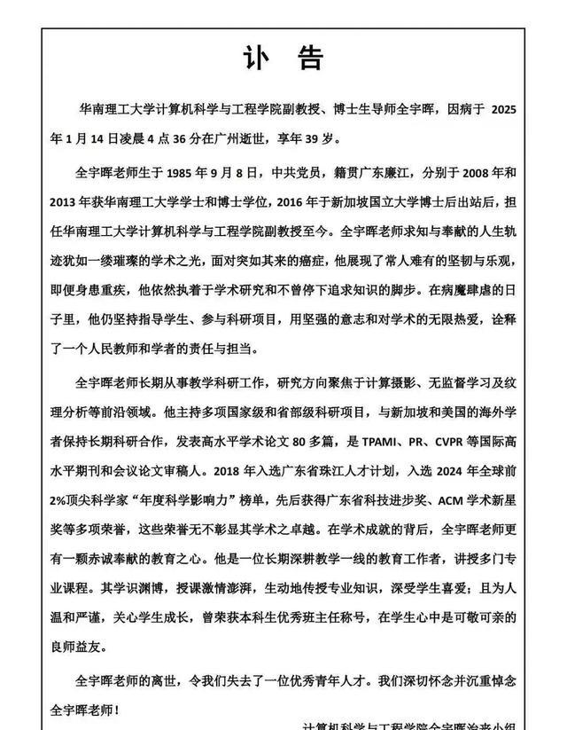 39岁华南理工全宇晖副教授离世,死因被曝光,学生吐露更多细节