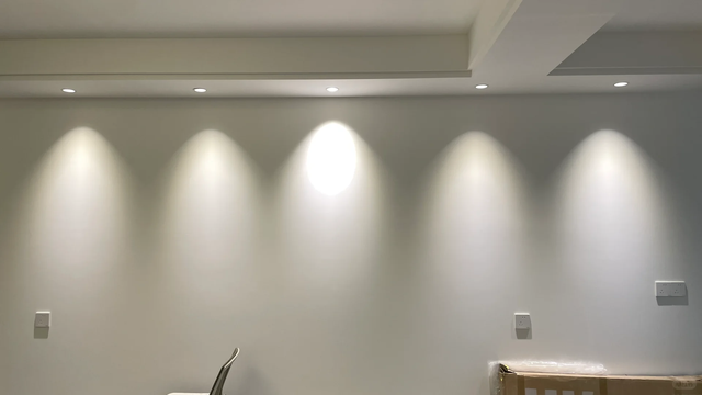 36°光束角的射灯,在离墙15公分、间距一米的时候,光斑边缘会自然衔接,形成连绵的山丘状,前一个光斑边缘和后一个会重叠三分之一,看着很连贯。