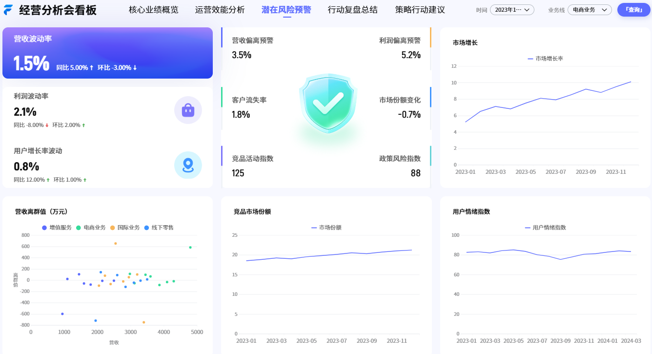 你要结合当下的市场情况和公司实际,提一两个最可能出现的风险就行,提前给各部门提个醒,做好准备,避免问题发生了再去补救。