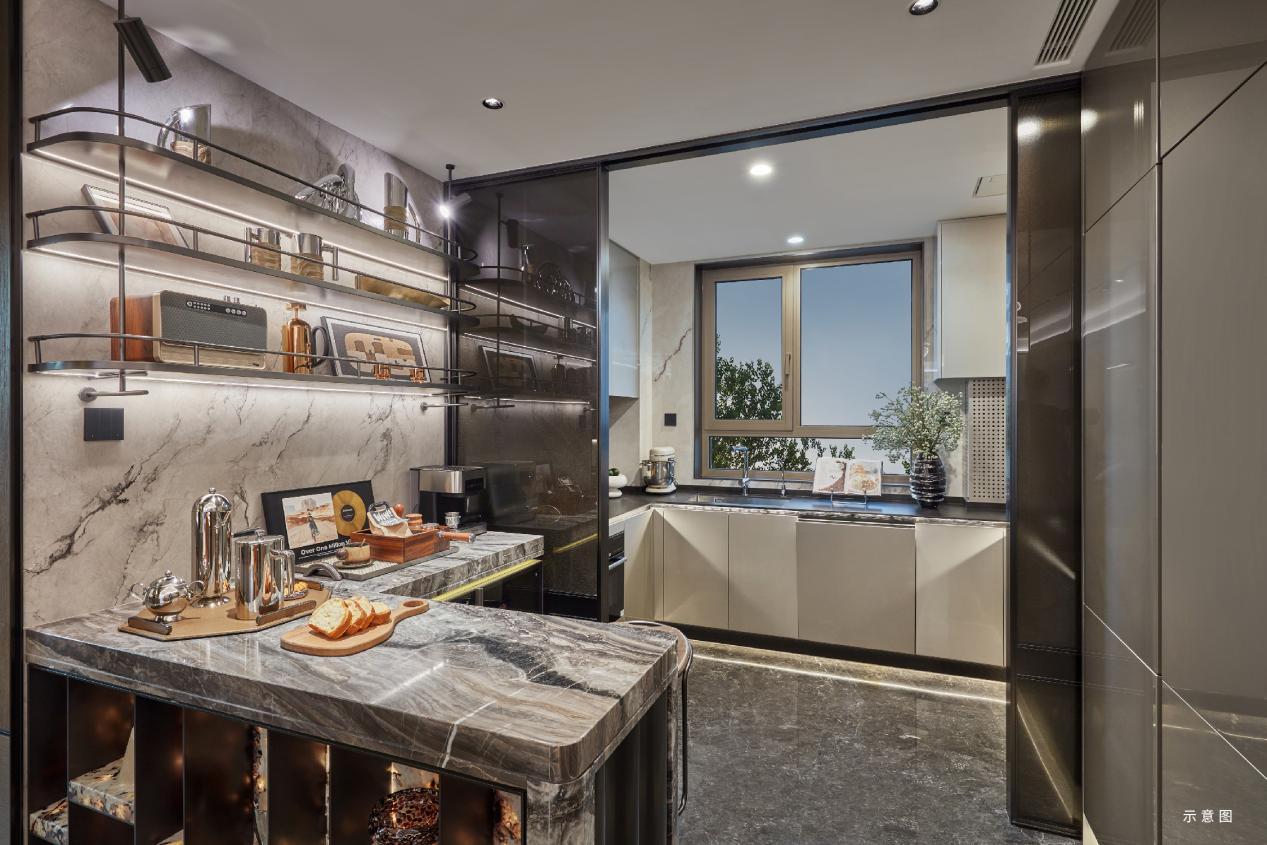 厨房采用“三段式”布局,洗、切、炒动线流畅,橱柜选用欧派、金牌、丽博等同档次品牌,柜门是汽车金属烤漆工艺,内部还配置了电动升降储物架、拉篮,小到调料瓶、大到锅具,都能找到合适的收纳位置。
