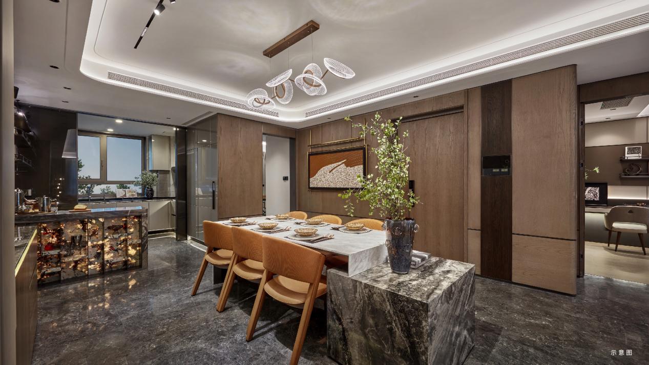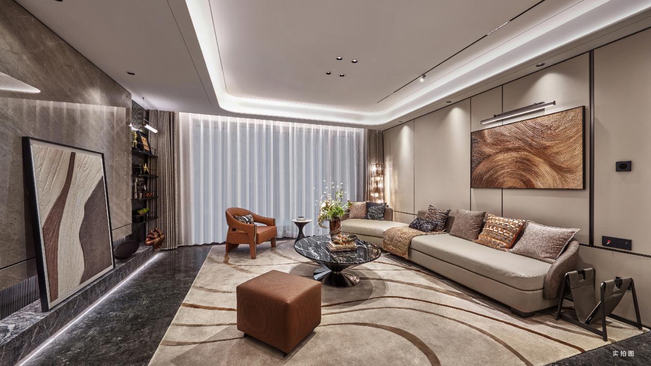 公共区域地面通铺 “星耀灰” 大理石,纹理细腻且耐脏易清洁,搭配宝嘉迪灰石材的客厅电视背景墙,以及沙发背景墙的皮革硬包,整体风格简约大气,又不失质感。