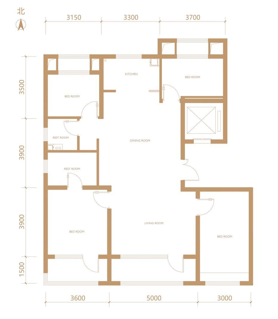 户型采用经典的“四叶草”格局,四个卧室分布在房屋四角,互不干扰。南向三面宽的设计,让主卧、老人房(或儿童房)和客厅都能享受到充足采光,尤其是客厅约5米的超大面宽,搭配全景落地窗,不仅拉伸了视觉空间,更让阳光轻松铺满整个公共区域。周末时,孩子在客厅玩耍,父母在厨房准备餐食,视线通透无遮挡,既能互动又能彼此照看,契合多代同堂的生活需求。