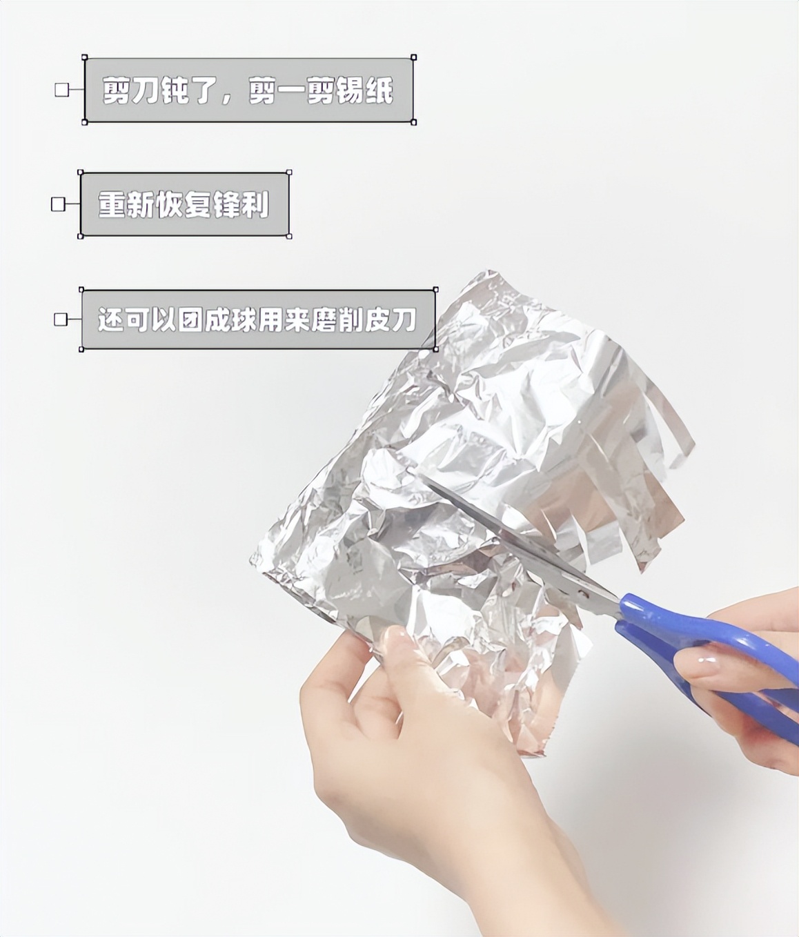 想要让剪刀重新变得锋利起来,只需要一张锡纸就搞定了,用剪刀直接在锡纸上面剪一剪,反复多剪几次就行了。