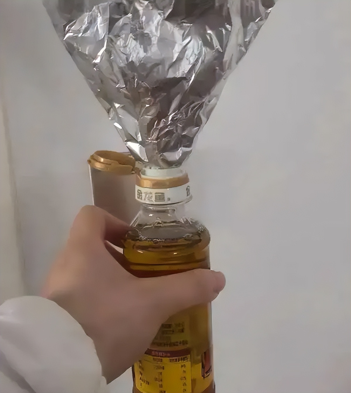 把锡纸捏成漏斗的形状,把它放在瓶子口,不管是倒油也好,还是倒谷物都很方便。