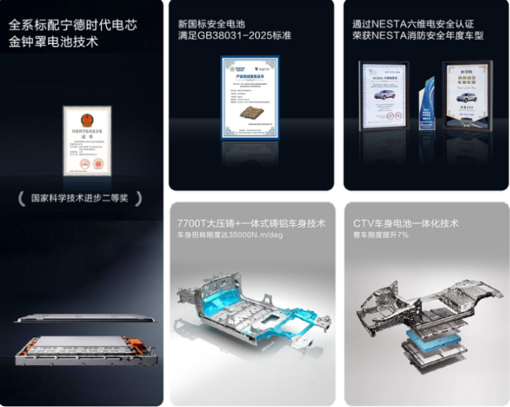 电池安全:采用工信部今年3月发布的强制性新国标电池,全系搭载宁德时代电芯、金钟罩磷酸铁锂电池,超长寿命60万公里衰减无感知,循环寿命大于5000次,电池零热失控。