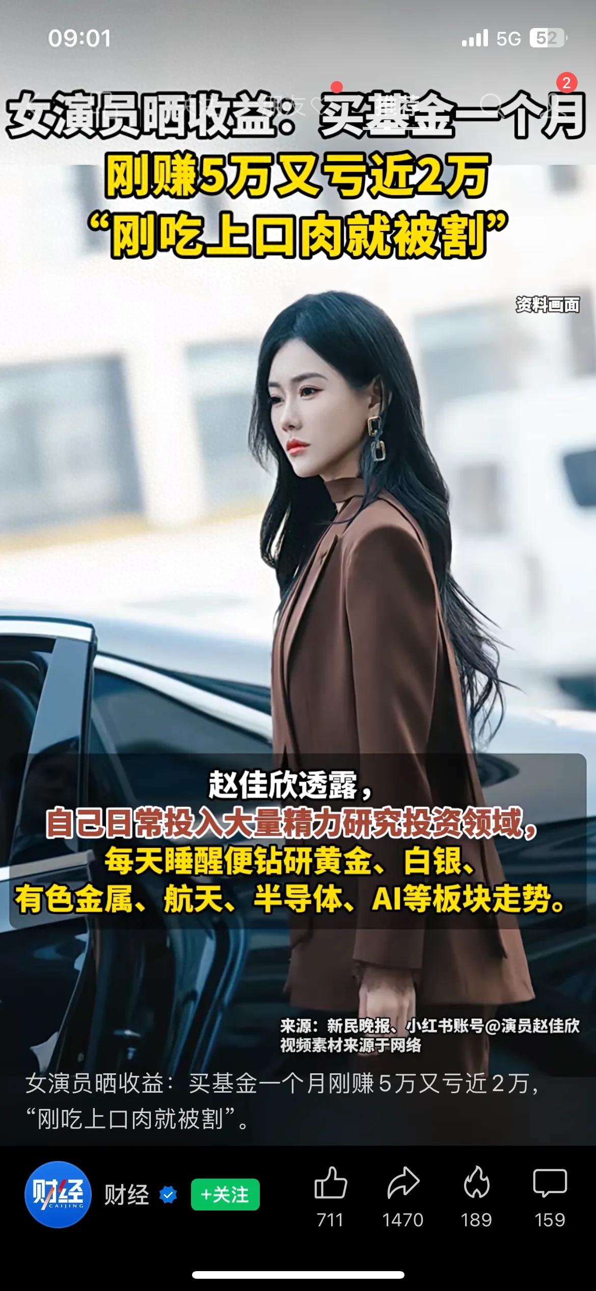 女演员赵佳欣近期晒出基金收益,引发全网热议:一个月收益达5万,短期内回吐近2万,她直呼“刚吃上肉就被割”,还表示自己每天花大量精力研究黄金、白银、有色金属、航天、AI等板块走势,依然难以规避市场波动。
