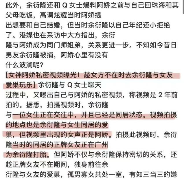 阿娇后来透露自己不会结婚了,而在2月16日,媒体爆料在余衍隆有女朋友且同居的情况下阿娇与其交往,声称是阿娇追求的男方。