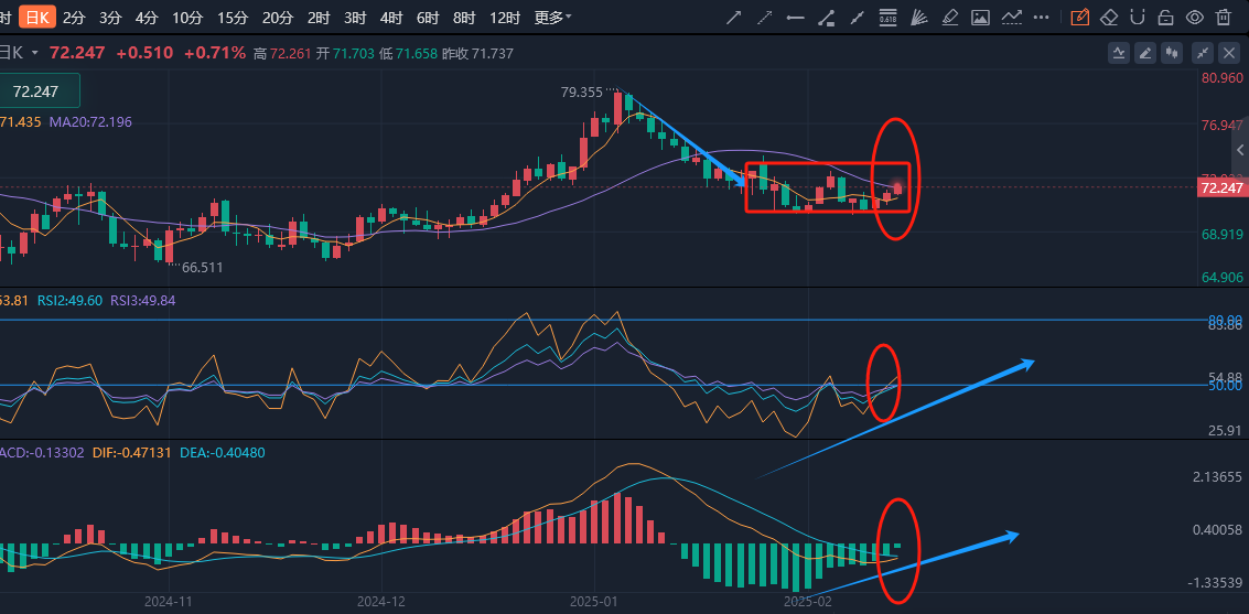 首先,从技术面来看,本轮下跌行情,自2月7号开始在下方筑底,当前的WTI原油期货显示出了较为明显的买入信号。移动平均指数和多种技术指标均指向强力买入,例如RSI,以及MACD等,这些都表明市场短期看涨情绪浓厚。同时,多个时间框架下的均线系统也支持这一观点,它们大多处于上升状态,并且短期内没有出现明显的反转迹象。