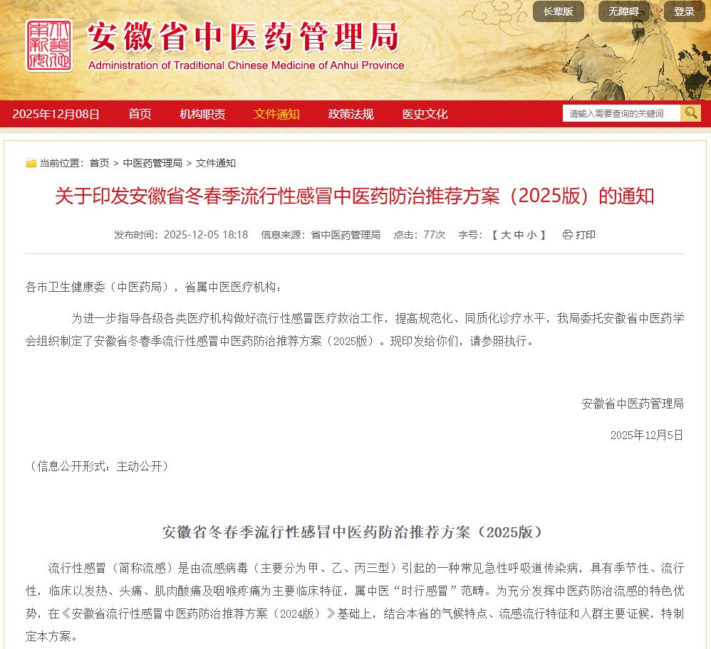 为充分发挥中医药防治流感的特色优势,近日,安徽省中医药管理局印发《安徽省冬春季流行性感冒中医药防治推荐方案(2025 版)》。该方案密切结合安徽省气候特点、流感流行特征和人群主要证候,为应对流感提供中医药防治参考。