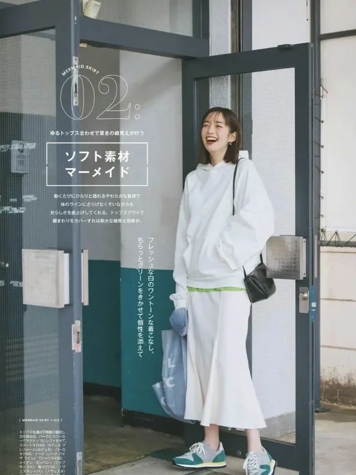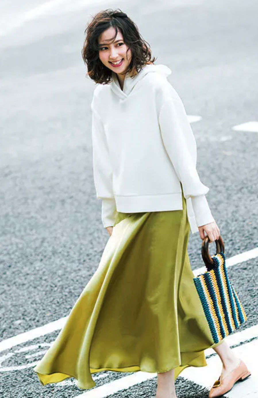 白色卫衣搭配绿色缎面半裙,卫衣的轻松氛围能够淡化缎面裙的成熟韵味,美得轻松而惬意。