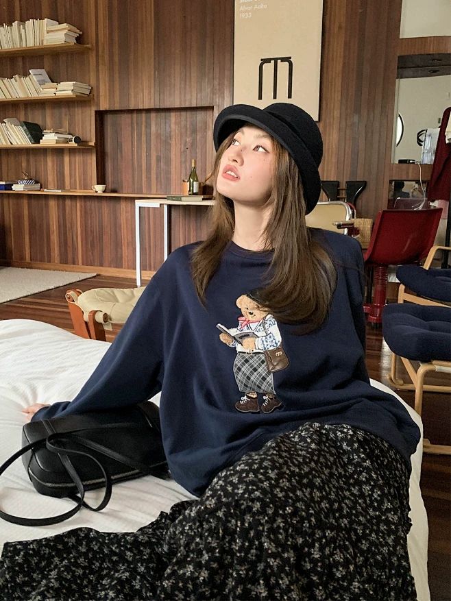 藏青色卫衣搭配黑色碎花半裙,卫衣的休闲感与半裙的浪漫气息相互平衡,使整体穿搭既舒适又不失优雅,既简约又不失浪漫气息。