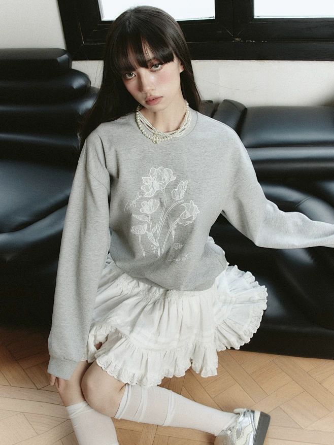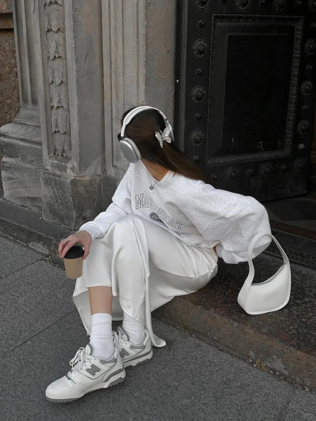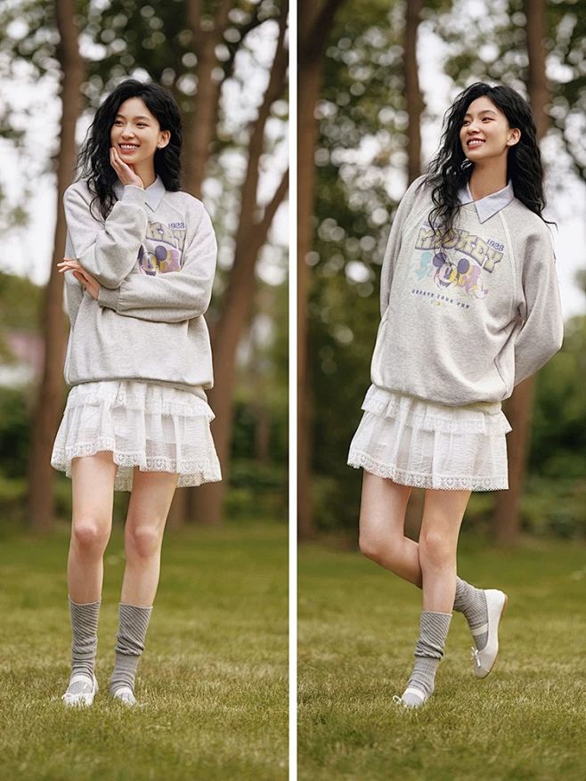 浅灰色卫衣搭配白色短裙,再配以银色芭蕾鞋和白色长袜,再配珍珠项链点缀,打造出一套轻盈灵动、适合约会的装扮。