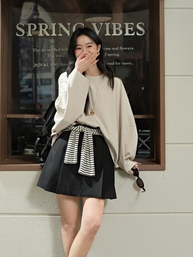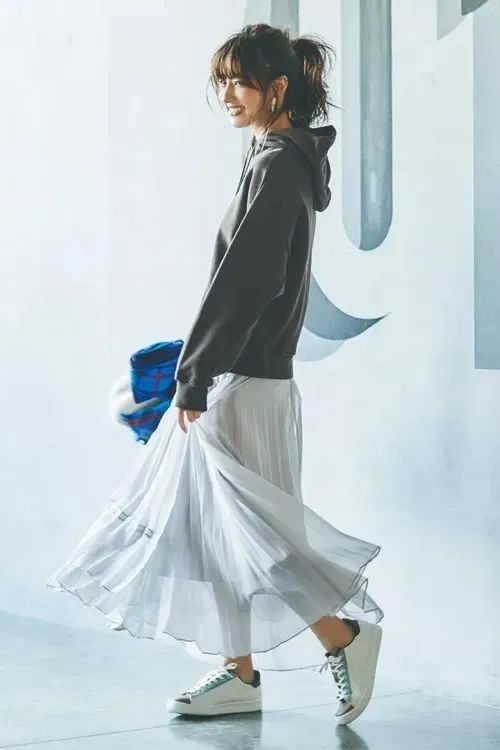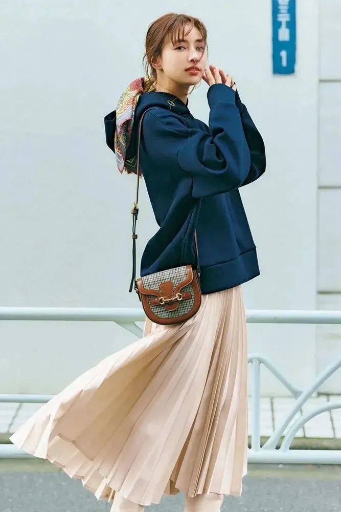 卫衣与半裙的搭配形成别具一格的风格,尤其在约会场合,这种组合既能展现休闲的自在感,又不失女性的柔美与优雅。