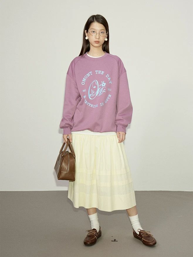 暗紫色复古字母印花卫衣搭配淡黄色A字半裙,半裙具有优雅而甜美的气质,A字型设计能够很好地修饰身材,使腿部线条看起来更加修长。