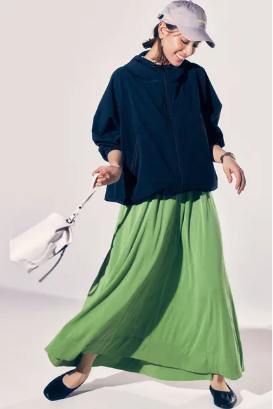 如果卫衣是深色系,可以选择同色棒球帽呼应起来,再配一条浅色裙子来提亮整体穿搭。