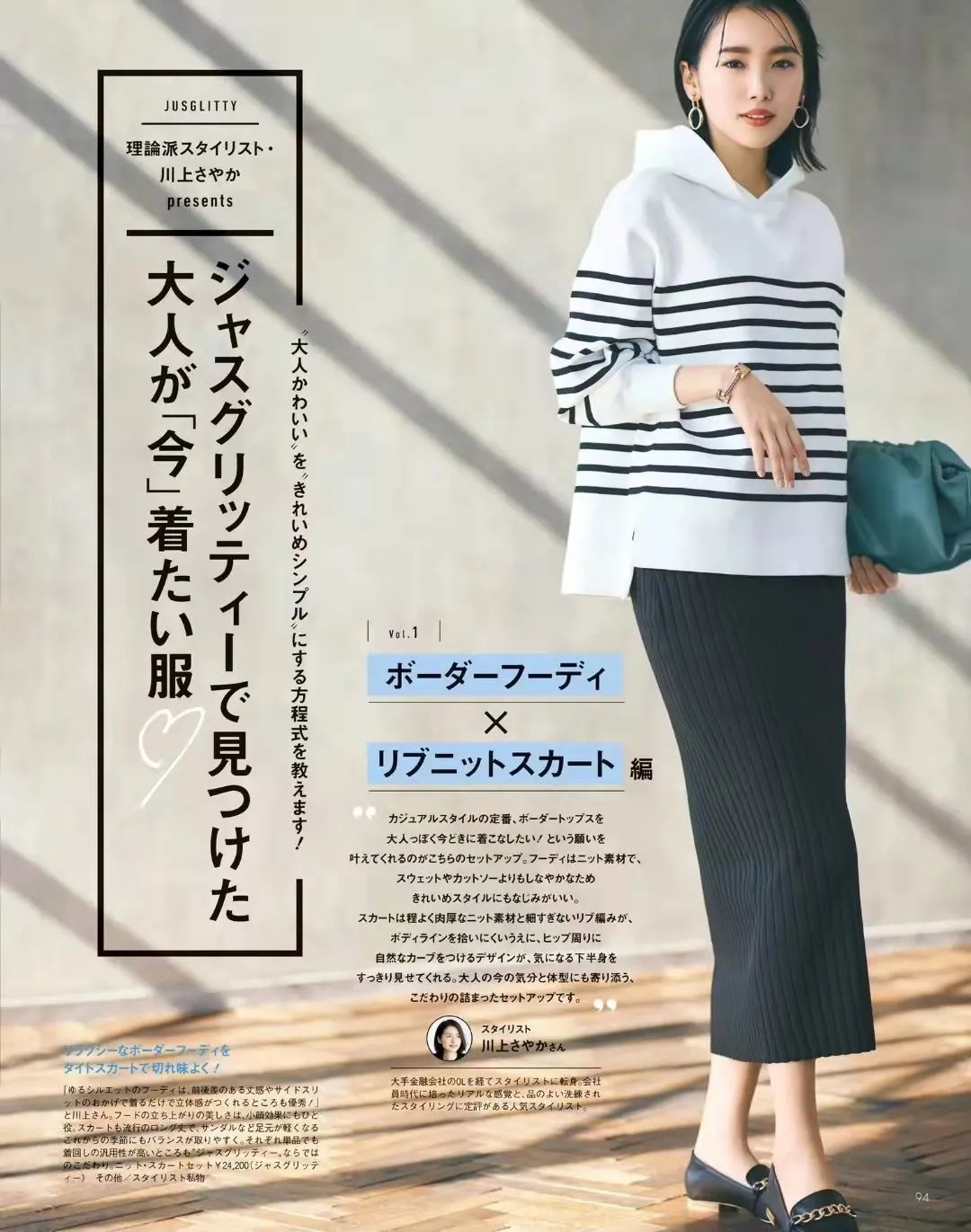 可以选择条纹卫衣,搭配黑色直筒裙,再穿一双乐福鞋、高跟鞋,会大大减少卫衣的休闲感。