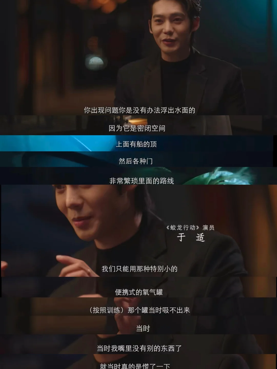 ➖于适在《蛟龙行动》的采访中有谈到过水下拍摄的艰难,很有可能在你需要氧气罐的时候它是没气的,水下本来就困难重重,更何况是在突发意外时,这种时候,换作任何人都会害怕恐慌~