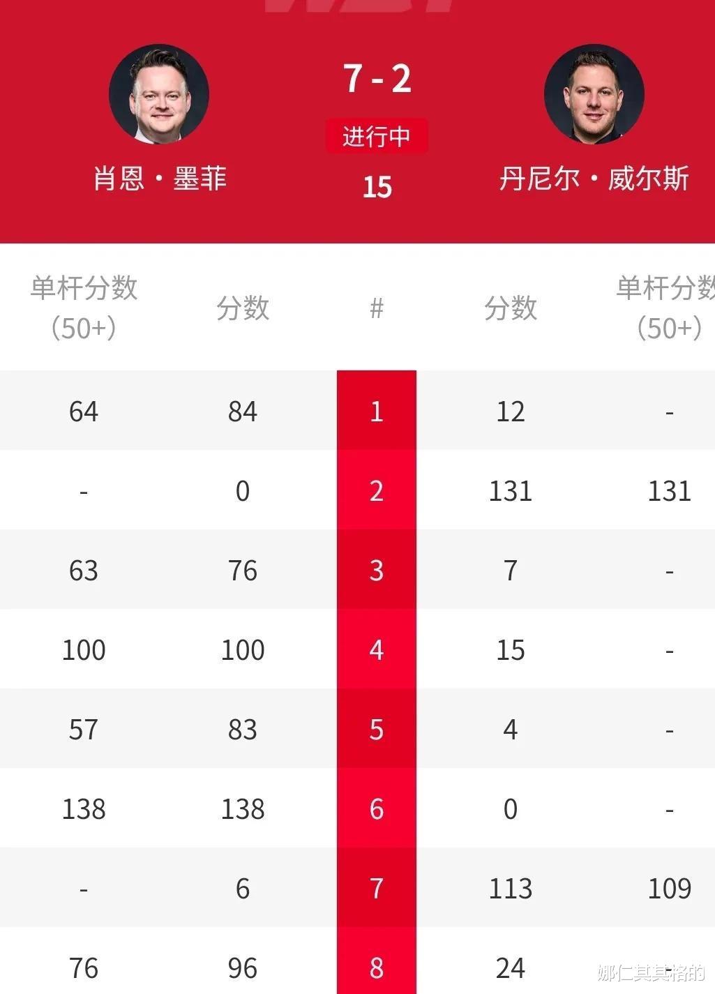 同时进行的另一场比赛中,肖恩·墨菲对阵威尔斯。肖恩·墨菲展现出火热的状态,轰出单杆138分、100分、63分和57分,最终以7-2大比分领先结束第一阶段的比赛。