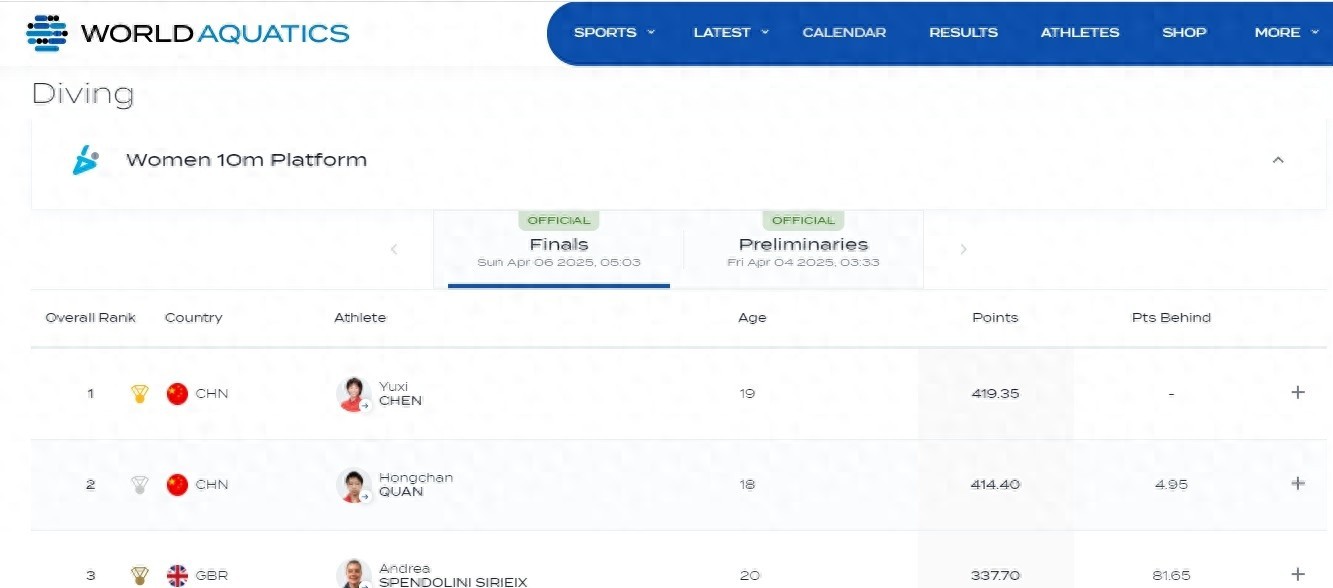 4月6号,墨西哥。世界杯跳水赛,女子10米台决赛。陈芋汐419.35分,全红婵414.40分,包揽冠亚军。第三名才337.70分,差距明显。这就是“断层式”领先。