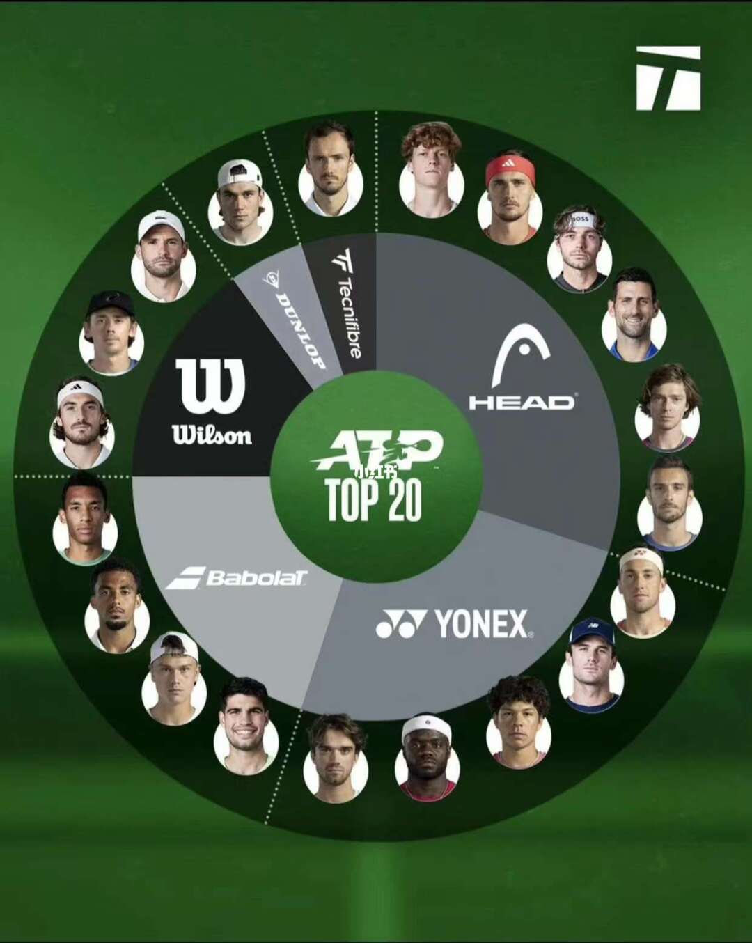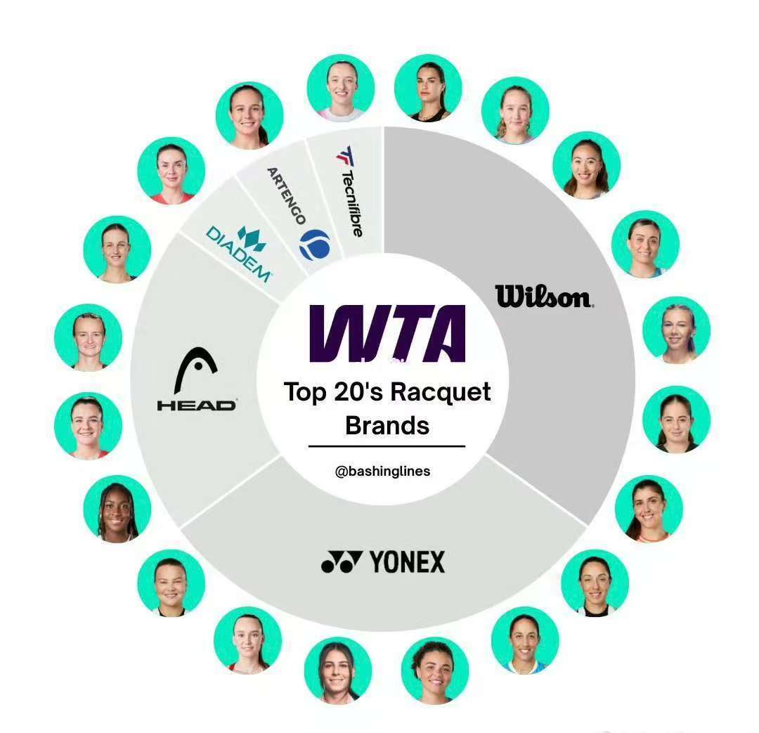 【WTA&ATP前20使用球拍品牌分布】 WTA: Wilson:7位 Yonex:6位 Head:4位 Diadem:1位 迪卡侬:1位 Tecnifibre:1位 ATP: Head:6位 Yonex:5位 Babolat:4位 Wilson:3位 Dunlop:1位 Tecnifibre:1位 尤尼克斯后来居上,使用的球员越来越多,排名也都越来越高。而有一些老品牌也渐渐淡出“荧幕”。使用的球员越来越少,排名也都比较低。