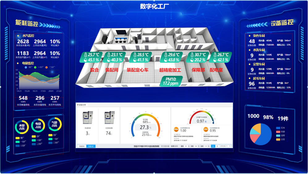 采用数字孪生、GIS电子地图等技术,在物联网平台构建虚拟工厂模型,对全厂生产车间的能耗概览、能耗趋势、能耗占比分析和能耗排名等数据的虚拟仿真。帮助企业及时发现能耗异常和浪费情况,并采取相应的节能措施。