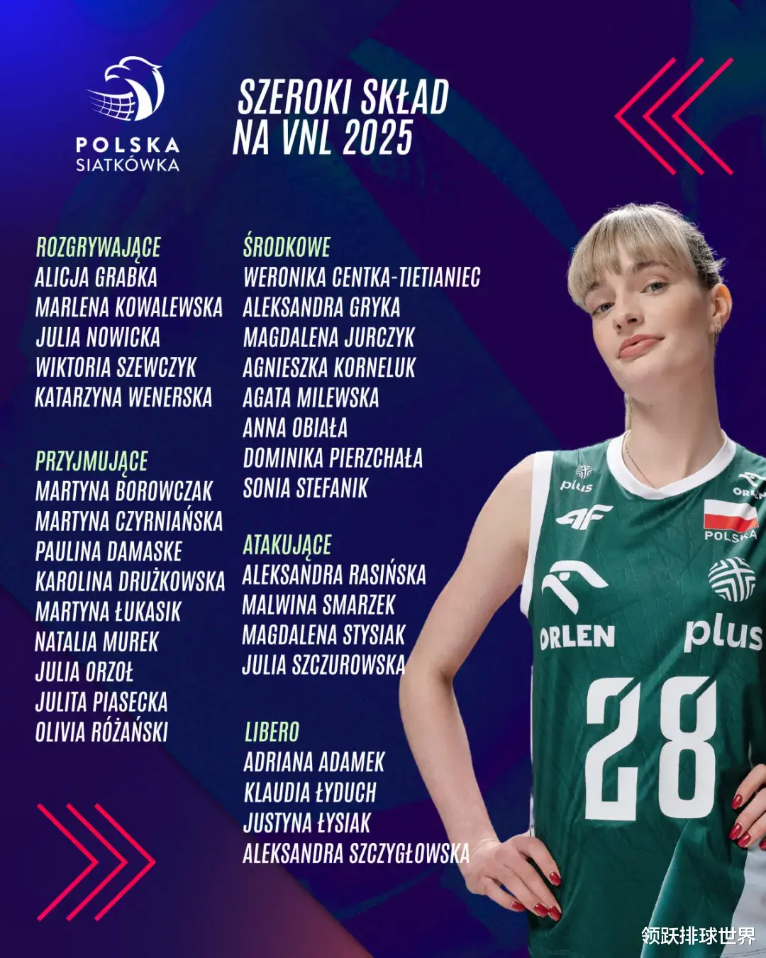 近日,随着2025年VNL世界女排联赛报名截止日期的临近,波兰排协正式公布了国家队的大名单。这份名单由主教练斯特凡诺·拉瓦里尼(Stefano Lavarini)挑选,涵盖了多个位置的优秀球员,其中既有经验丰富的老将,也有首次入选的年轻新星,具体情况如下: