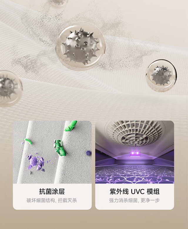 虽然叫空气净化器,但它不是简单的过滤颗粒物这么简单,还有杀菌功能。用了抗菌涂层+紫外线UVC模块的“双重消杀”技术,让病菌无处可藏。